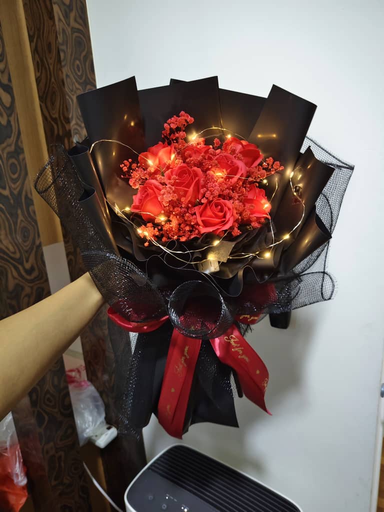 - ๐น Features: 8 red soap roses with red preserved baby breath and led light