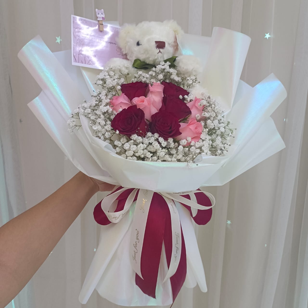 - Features 10 fresh red and pink roses with baby breath and bear